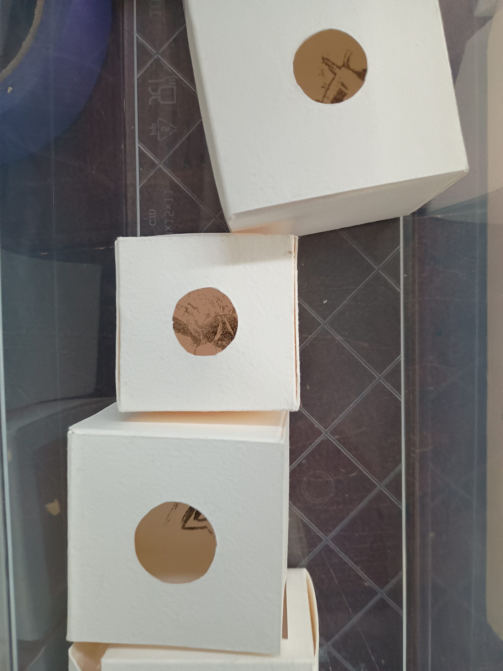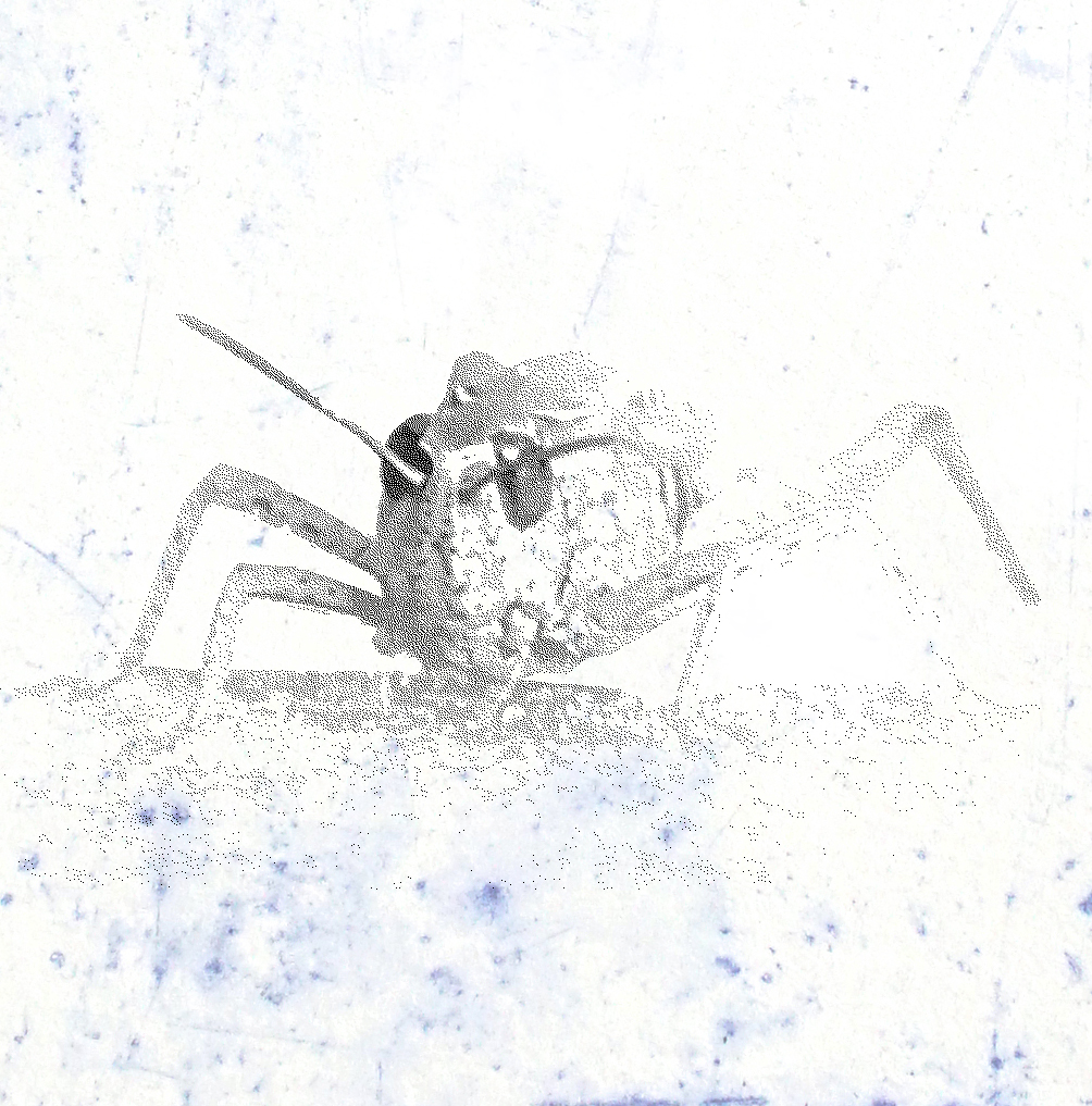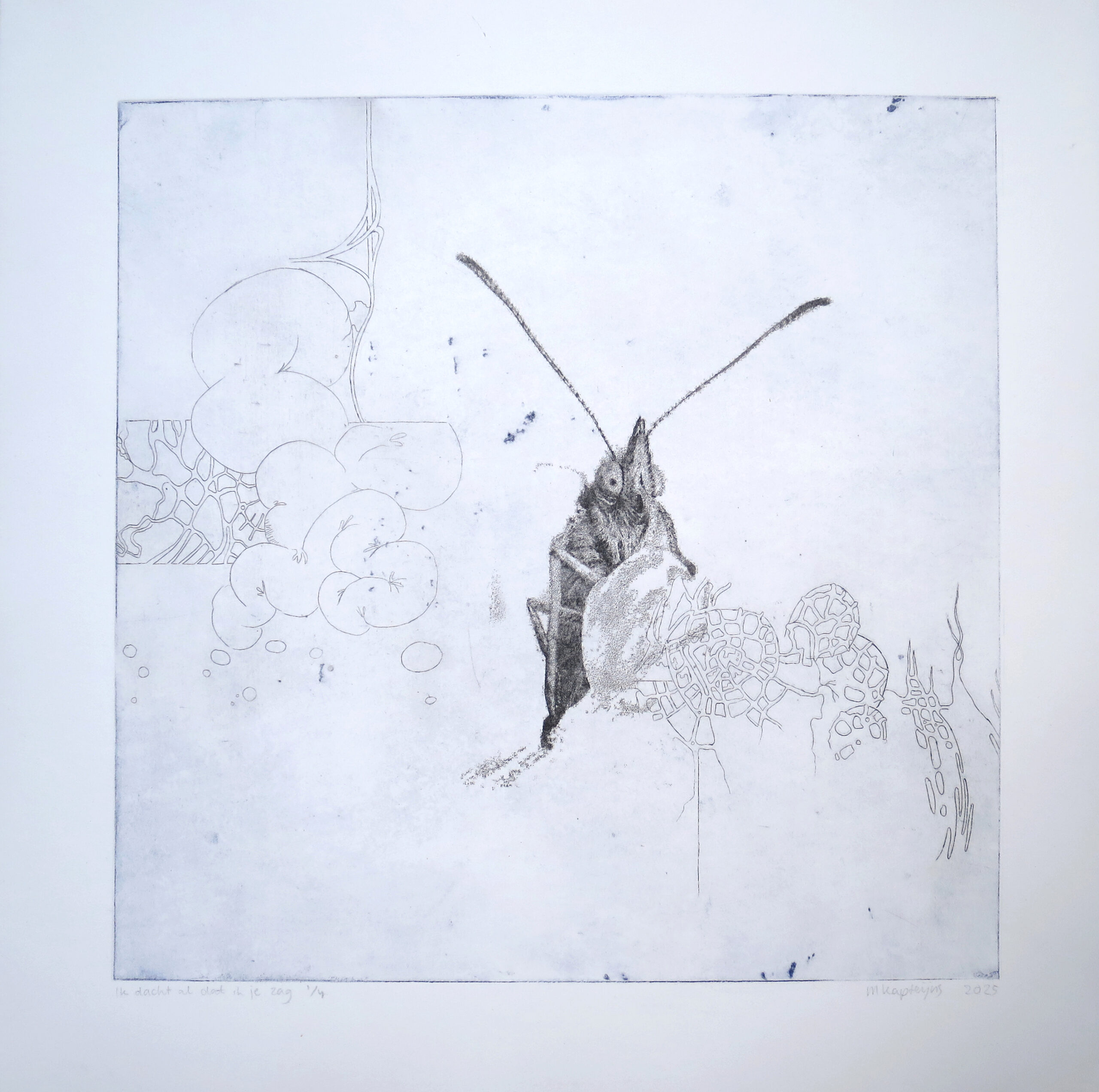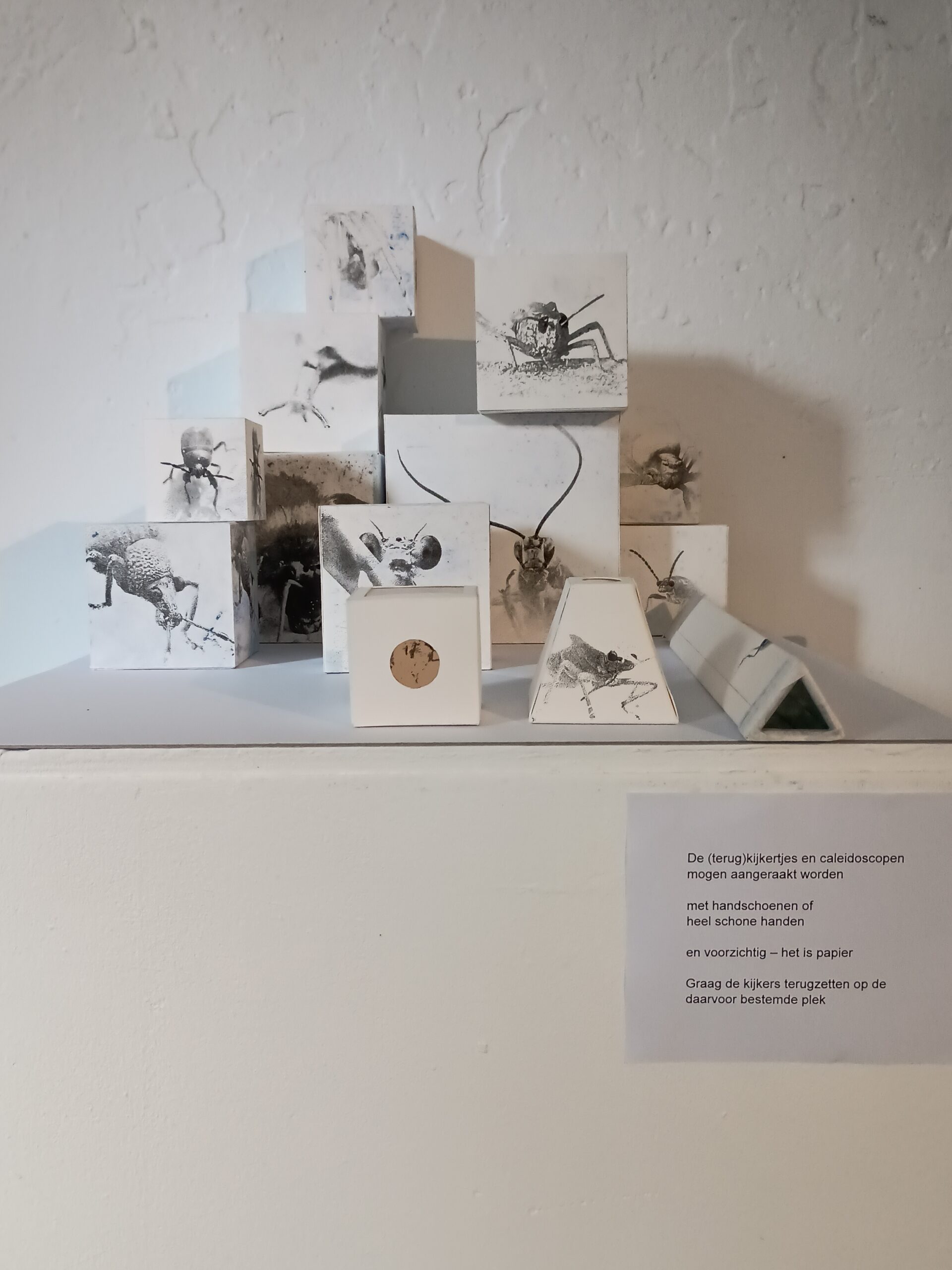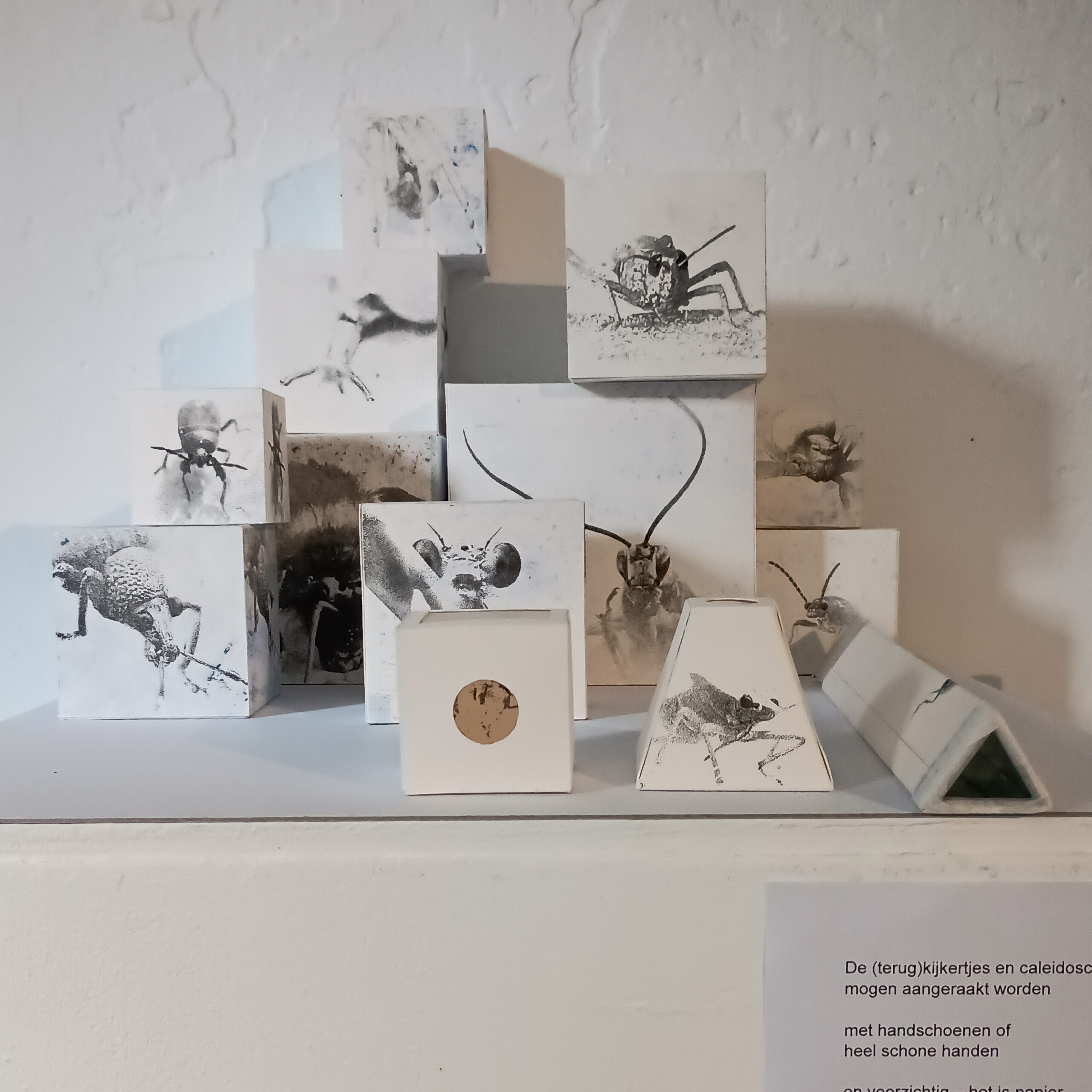 De terugkijkende insecten, spinnen, slakken, etc. heb ik gezien en gefotografeerd in mijn tuin, de foto’s zijn bewerkt en afgedrukt als polyester litho, de achtergronden zijn als ets afgedrukt, er is er dan ook geen een hetzelfde.